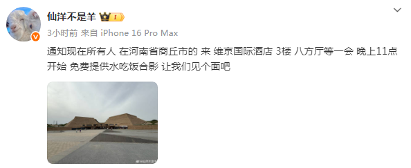 仙洋去参加酒吧商演了,30万一场,酒吧老板挺重视车接的派人,仙洋发动粉丝力量,发声喊话商演地等你们来!仙洋发文:通知现在所有人 在河南省商丘市的 来 维京国际酒店 3楼 八方厅等一会 晚上11点开始 免费提供水吃饭合影 让我们见个面吧。
