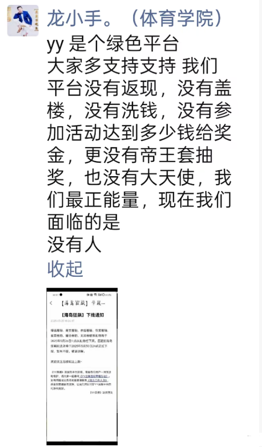 官方的公告下架的卷轴,龙小手发圈内涵,YY是个绿色平台,大家多多支持,我们平台没有返X,没有盖楼,没有洗Q,没有参加活动达到多少钱给奖金,更没有帝王套抽奖,也没有大天使,我们最正能量,现在我们面临的是没有人。