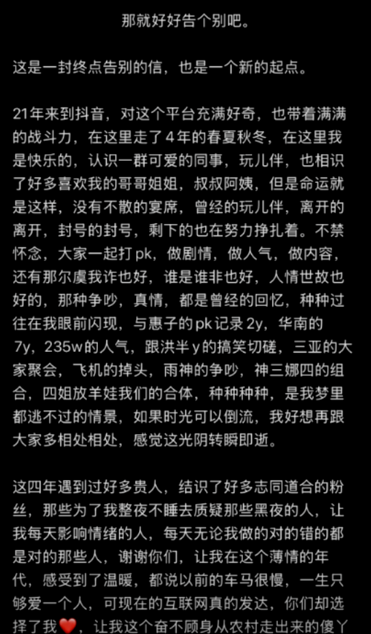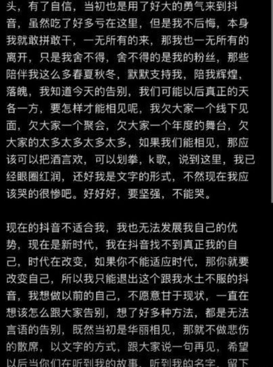 娜美长文告别抖音,一封重点告别信,也是一个新的起点。娜美结束了抖音生涯,打拼了,没达到预期的效果,娜美决定重回KS平台,也就是说彻底88了抖音。