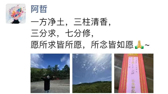 阿哲到五台山发了一个朋友圈,还有给全体哲家军求的福。阿哲发文:一方净土,三柱清香,三分求,七分修,所求皆所愿,所念皆如愿!