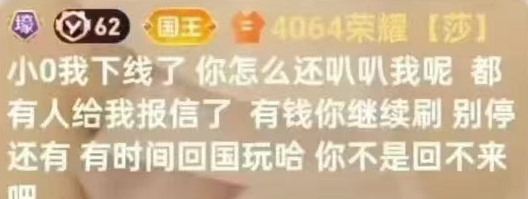 000大号上线了,兰梦莎说俩人因为误会分手一年多了,000上线正好荣耀也在,000喊话荣耀放宽心,自己只是逛逛而已,刷你也刷不过我。荣耀喊话000:小0,你怎么还叭叭我呢,都有人给我报信了,有钱你继续刷,别停,有时间回国玩哈,你不是回不来吧。