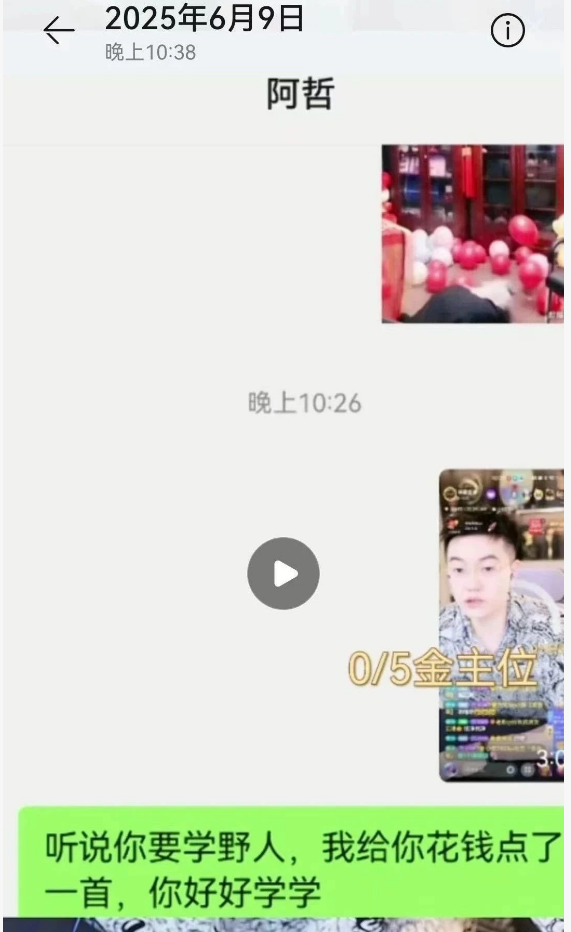 阿哲WX出现玄律的视频了,一大哥得知阿哲要学习野人这首歌,在玄律直播间花钱点的,然后把玄律唱的视频发给了阿哲,让阿哲看视频,跟玄律学学咋唱的野人这首歌。真扎阿哲啊,歌不唱了都不可能学。