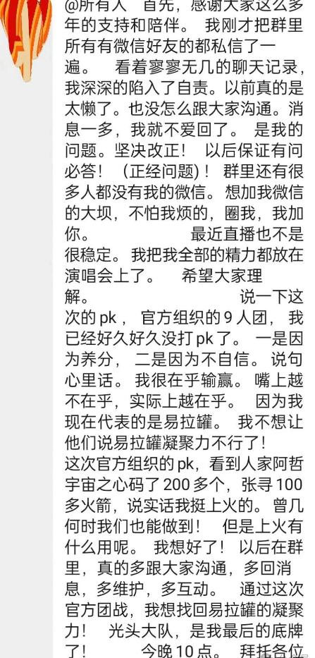 易阳的小作文来了,在粉丝群里发了,感谢大家这么多年的支持和陪伴,已经把微信群里的好友都私信了一遍,易阳要参加官方互动打九宫格团战了,希望大家出手帮助,拜托大家了。